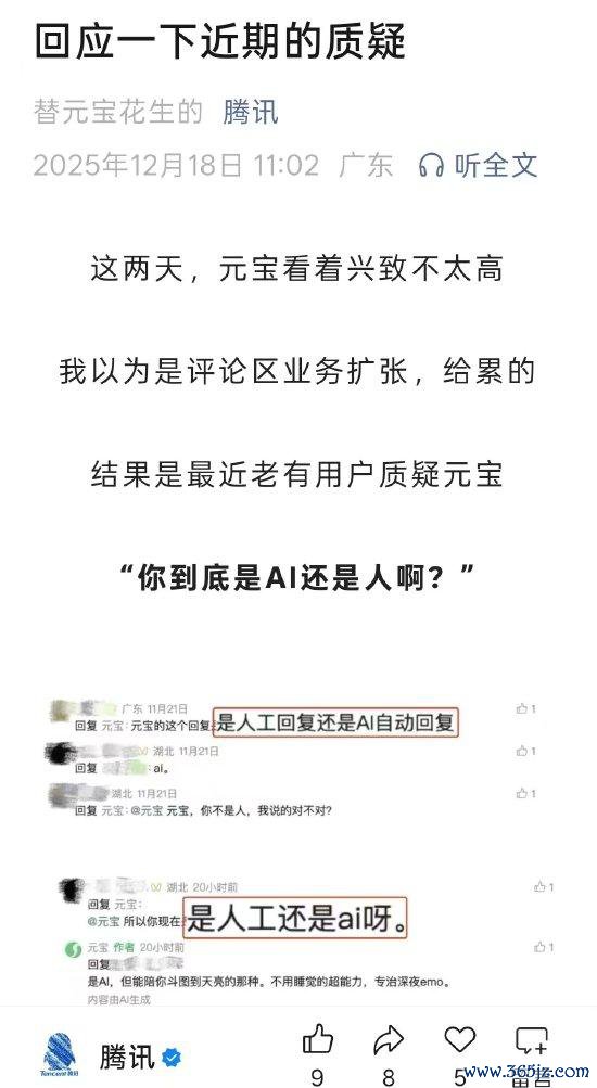 此外,腾讯还走漏,要是你收到了元宝的批驳回复底下莫得带“骨子由AI生成”的秀丽,那一定是背后的小编一字一板、多情有感的真东说念主回答。